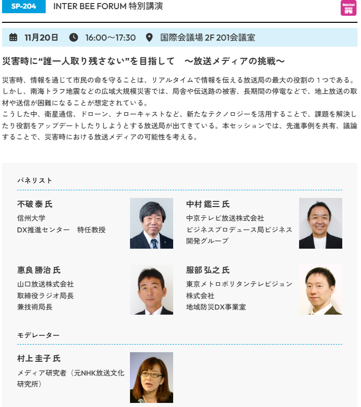 2つ目は、同じく20日(木)16時~、私がライフワークとして取り組んでいる災害時の情報伝達についてです。今回のセッションは、InterBEEらしく、テクノロジーに寄せた取り組みについて考えます。広域大規模災害の際、放送メディアはどこまで地域の災害対応に貢献できるのか、コメンテーターとして地域DXの専門家に入っていただき、先進事例の共有を通じて“攻め“の取り組みを考えて行きます。(https://www.inter-bee.com/ja/forvisitors/conference/session/?conference_id=3136)