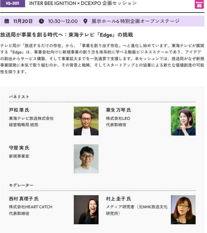 1つ目は20日(木)10時半~、民放online(https://minpo.online/article/post-606.html)でも取材させていただいた、東海テレビの新規事業であるEdgeについてのセッションです。スタートアップ業界をリードする錚々たるメンバーの中に加わらせていただき、放送局の新規事業への挑戦の可能性と課題について考えていきます。(https://www.inter-bee.com/ja/forvisitors/conference/session/?conference_id=3138 )