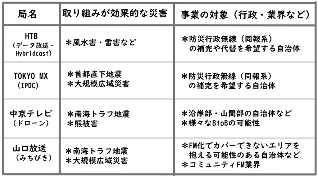 下記は、それぞれの取り組みについて、対象とする災害と、ビジネスの対象をまとめたものです。災害対応は地域によって異なりますので、どの取り組みに効果があるのか、自治体などとどういう事業モデルがありうるのか、全国の地域メディアの皆さんに考えていただければうれしいです。