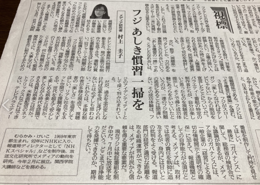 6月25日のフジ・メディア・ホールディングスの株主総会を受けて、共同通信に寄稿しました。26日に地方紙に掲載されました。有料版ですが、以下、山陰中央新報デジタルでは、登録すれば無料で読むことができますのでご案内しておきます。