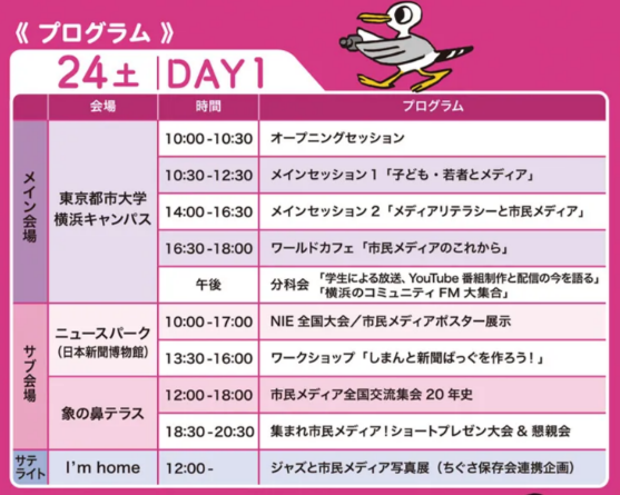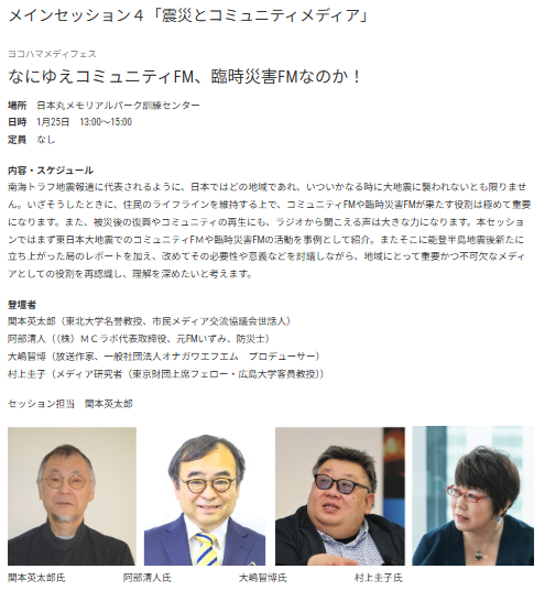 今月25日、市民メディア全国交流集会、通称「メディフェス横浜2026」で「震災とコミュニティメディア」のセッションに登壇します。横浜にある日本丸メモリアルパーク訓練センター(https://www.nippon-maru.or.jp/training/)で13時~15時です。ご関心ある方は是非お越しいただき、一緒にディスカッションできると嬉しいです。このほか、コミュニティFMのセッションなど、市民メディアに関するセッションやイベントが多数用意されています。(要申し込み・有料)