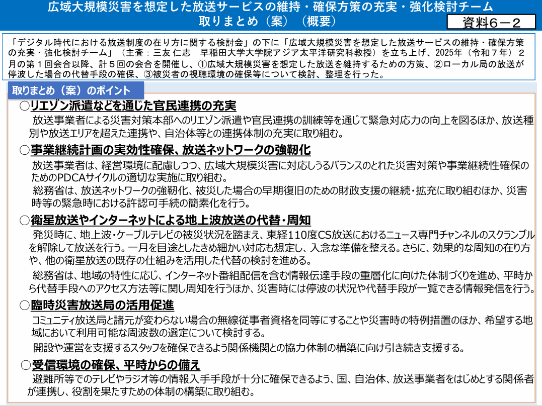 今回は、総務省「デジタル時代における放送制度の在り方に関する検討会」の「広域大規模災害を想定した放送サービスの維持・確保方策の充実・強化検討チーム」の取りまとめ案に対するパブコメを提出しました。