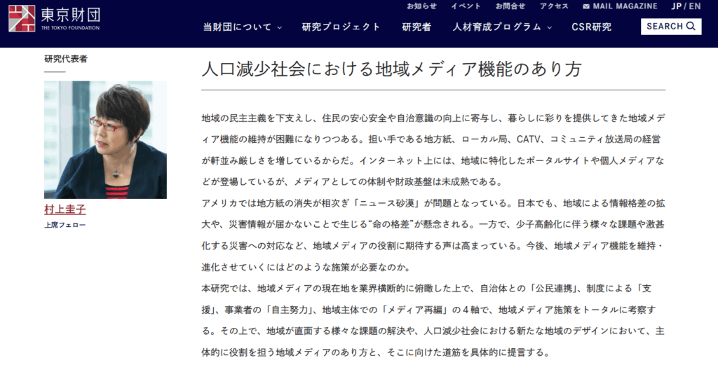 東京財団では、人口減少社会における諸課題について新規研究プロジェクトを立ち上げますが、私が担当するのは、「人口減少社会における地域メディア機能のあり方」についてです。
